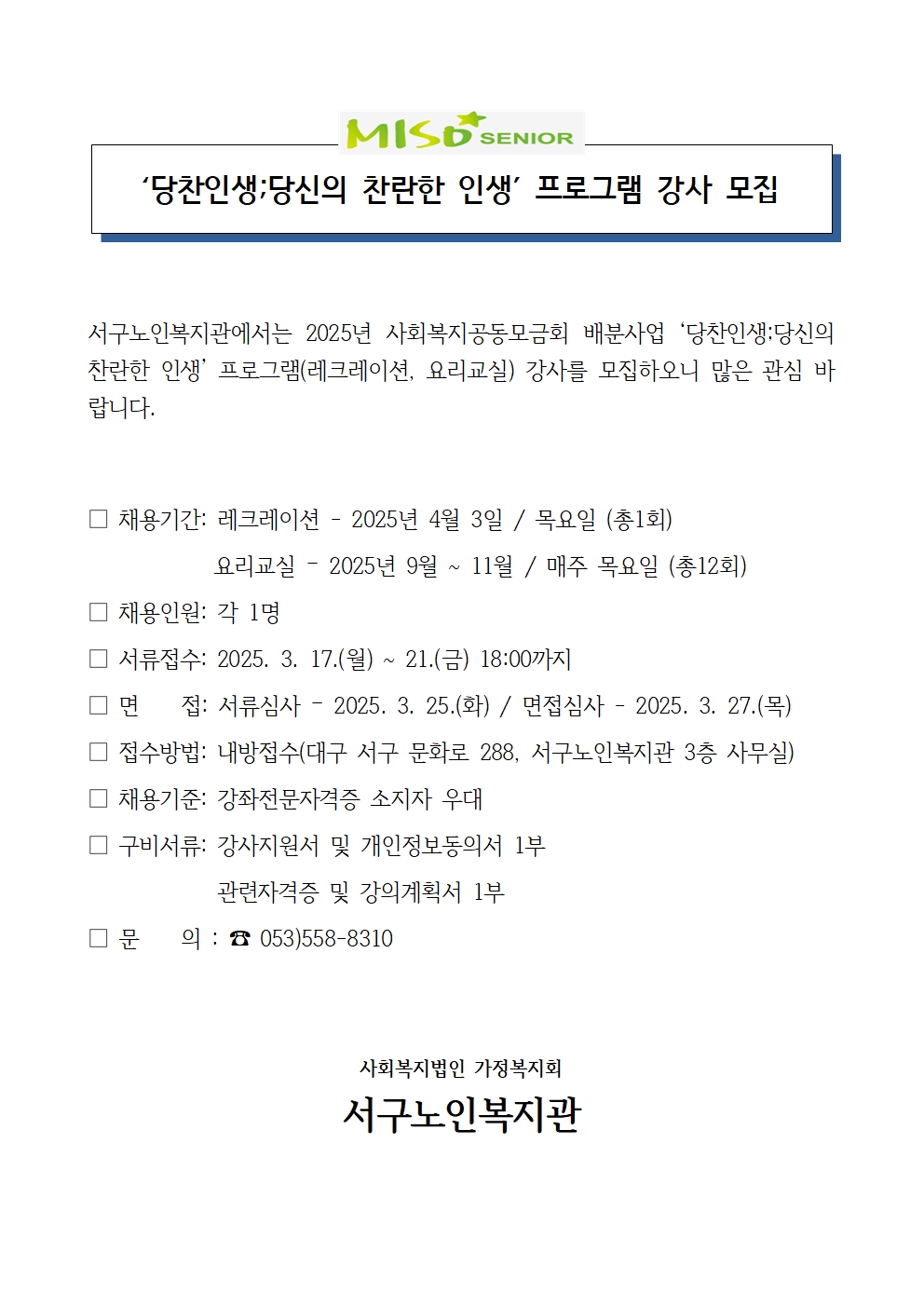 ● 접수방법 : 내방접수 (대구 서구 문화로 288 서구노인복지관 3층 사무실) ● 채용기준 : 관련자격증 소지자 우대 ● 구비서류 : 강사지원서 및 개인정보동의서 1부, 관련 자격증 각 1부, 강의계획서 1부